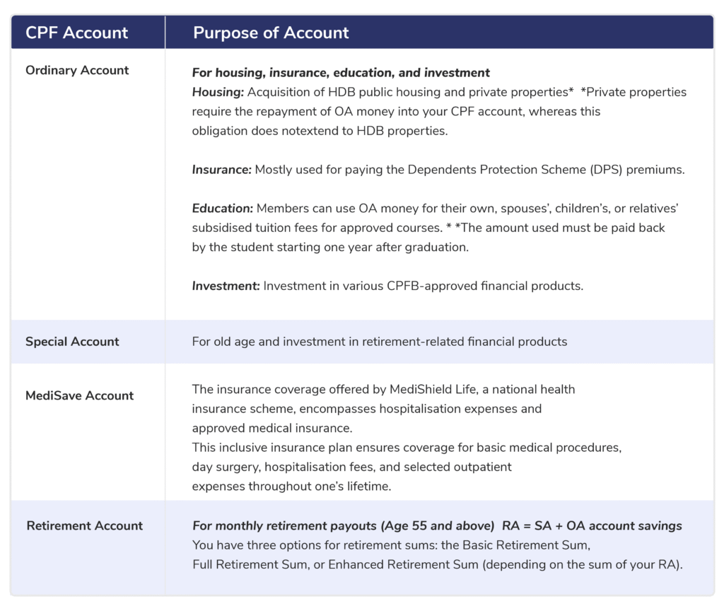 Your CPF contributions will be in three essential accounts: the Ordinary Account (OA), MediSave Account (MA), and Special Account (SA). Once you reach 55 years old, a Retirement Account (RA) is established to cater to your future needs.