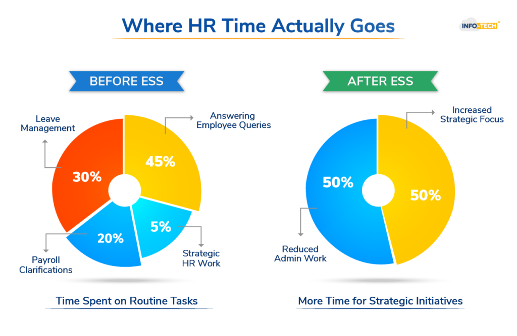 An ESS portal reduces repetitive queries, automates basic processes like leave requests, and allows HR teams to focus on more important tasks instead of handling routine administrative work.