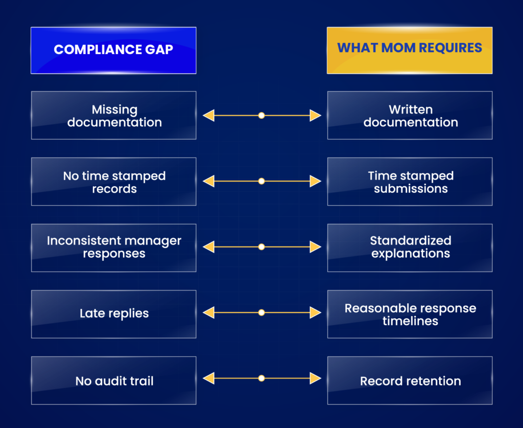 Without proper documentation, companies risk non-compliance during MOM audits. Missing records can be interpreted as unfair treatment or unmanaged requests, which may damage employer reputation and lead to further investigation. Digital systems prevent these risks by maintaining secure, complete, and timestamped documentation.