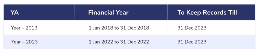 Your company must retain your bookkeeping records for at least 5 years from the relevant YA.
