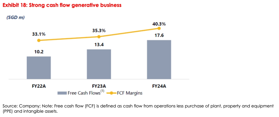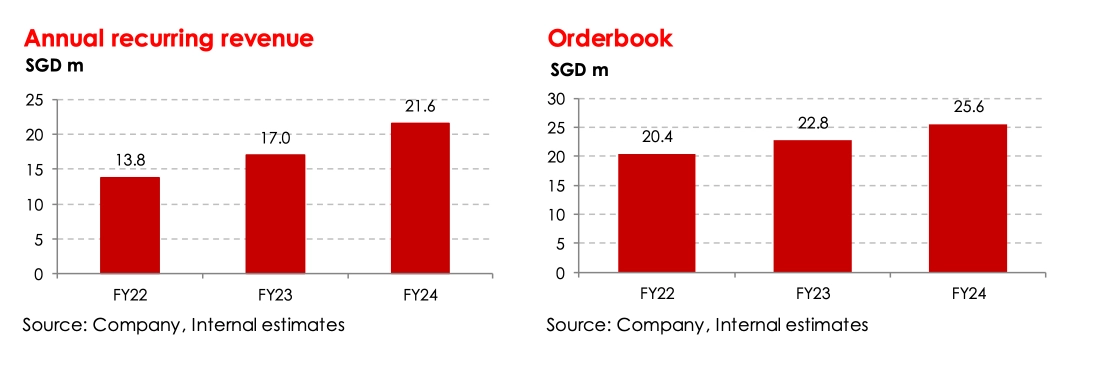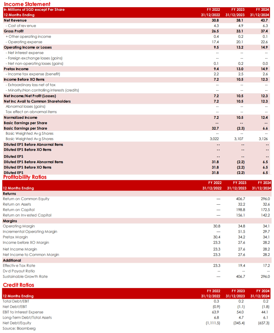 During the period, ITL continued to manage its operating expenses prudently. R&D expenses rose to 9.4% of revenue due to an increase in R&D headcount, while S&D costs declined to 17.8% of revenue, primarily from reduced marketing spend on products that have passed their incubation phase. Marketing efforts for HRMS remain a core focus for the company. After adjusting for one-off expenses (comprising listing-related expenses of SGD2m and SGD0.1m to relocate an office in Malaysia), ITL’s adjusted EBITDA grew 2.2% YoY to SGD9.5m, translating to a 1 ppt compression in EBITDA margins to 42.3%.