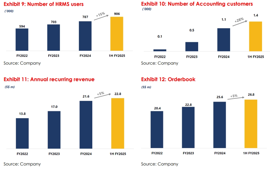 ITL’s HRMS (78.7% of FY24 revenue) was launched in 2016 and consists of nine modules which are essential to the HR function of its clients. It is designed to be simple and easy to use to minimise software and hardware integration complications, and to reduce the complexity of training to be provided to customers. Customers have the option of subscribing to a tailored suite of HRMS modules and related services to suit their HR requirements, with the flexibility to seamlessly add modules as their needs change. ITL has also launched a simplified version of its HRMS branded as DigiSME in Singapore and Malaysia, which is targeted at micro-SMEs that do not require the full suite of ITL’s HRMS modules during the early stages of their growth. In 1H25, ITL managed to grow its number of HRMS users by 15% to 906k users.