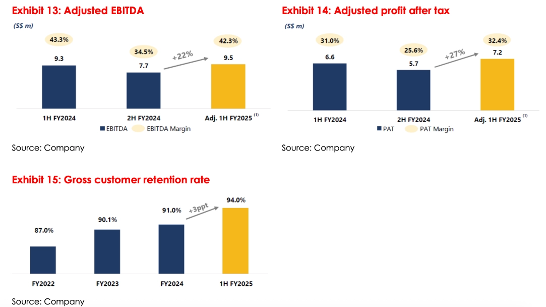 - Sequential improvements in 1H25 results - ITL’s 1H25 revenue grew 4.7% year -on -year (YoY) to SGD22.4m, led by faster growth from overseas markets. This was underpinned by a 15% and 28% growth in the number of HRMS users and Accounting customers respectively since the end of FY24. The company was also able to improve its gross customer retention rate by another 3 percentage points (ppt) to 94% over the period. Higher labour costs due to an increase in research and development (R&D) headcount were offset by lower selling and distribution (S&D) costs and tax expense, resulting in a 9% YoY increase in adjusted net profit to SGD7.2m. ITL declared an interim dividend of 1.55 Singapore cents per share, in line with its commitment to a payout ratio of not less than 50% of its net profit after tax for FY25 and FY26. Management is guiding for stronger growth in 2H25, driven by intensified marketing efforts as the company continues to focus marketing spend on initiatives with higher returns on investment (ROI).