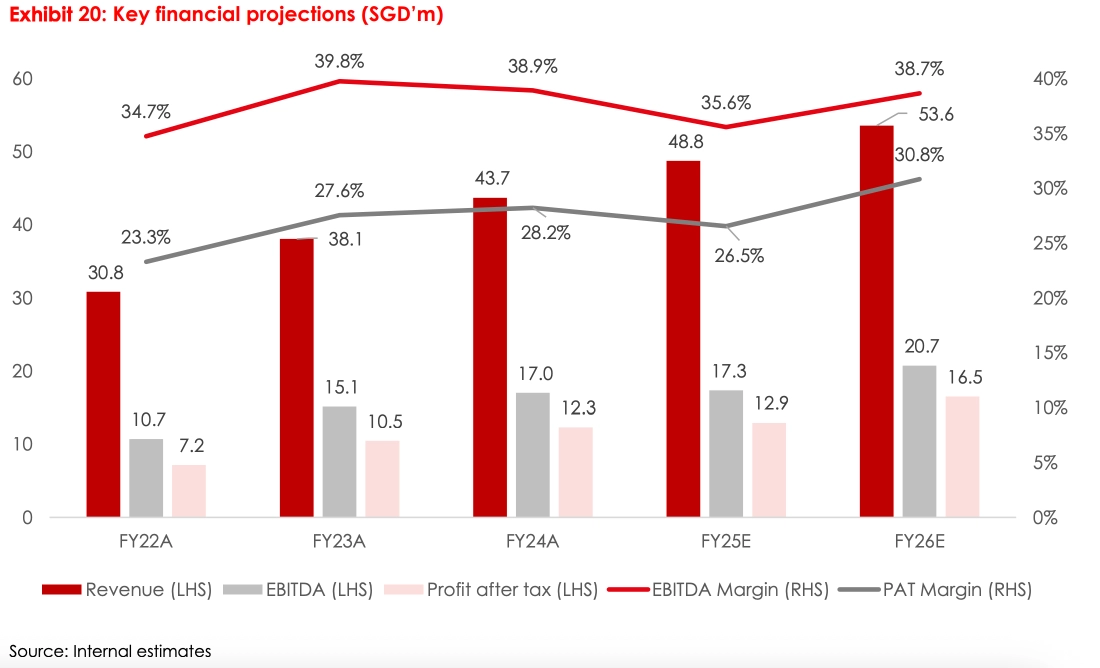 We are forecasting YoY revenue growth of 11.5% and 9.9% in FY25E and FY26E, respectively. Malaysia is expected to be the fastest growing market, followed by Hong Kong/India (Others) in FY25E, and finally Singapore given that it is the most mature market for ITL. In terms of product lines, we expect Info-Tech Accounting Software revenues to grow at a faster pace than HRMS in FY25E given that it is a relatively newer product offering for the company. On the bottom line, we are forecasting profit after tax (PAT) growth of just 4.9% YoY in FY25E. The 1.7 ppt compression in PAT margin from 28.2% in FY24 to 26.5% in FY25E is driven by one-off listing and relocation expenses of SGD2.1m incurred in 1H25. Adjusted PAT would have grown 19.4% YoY. PAT growth is expected to recover to 26.7% in FY26E, translating to an expansion of margins to 30.6%. We note that management has committed to a payout ratio of not less than 50% of its net profit after tax (excluding exceptional items) for the period from its listing date to 31 Dec 2025 and for FY26.