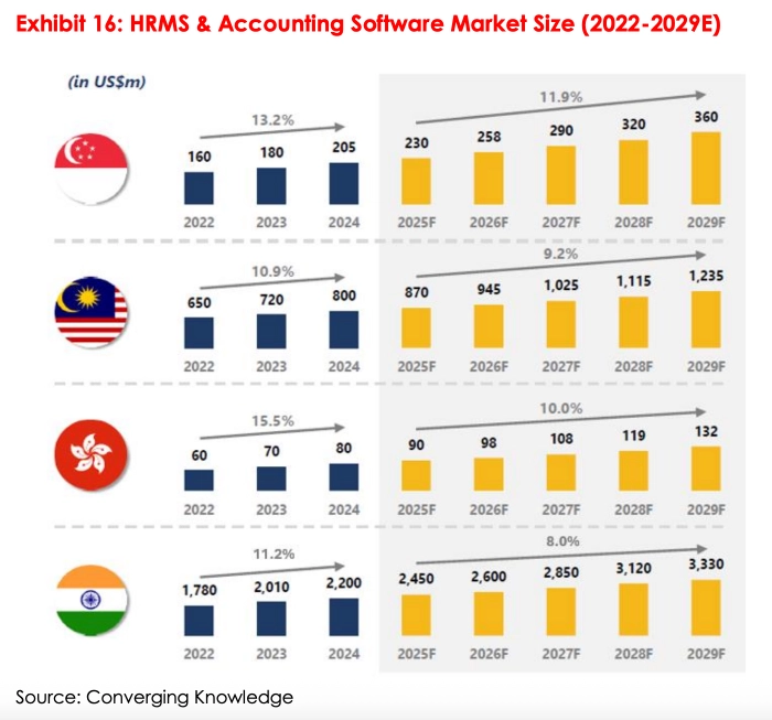 ITL’s HRMS specifically targets SMEs, which – according to the World Economic Forum – accounts for approximately 90% of all firms globally. Based on Converging Knowledge estimates, the total addressable market (TAM) for cloud-based SaaS HRMS and Accounting Software for SMEs is worth SGD17.3b, reflecting the market’s significant growth potential. In particular, the TAM for Singapore, Malaysia, Hong Kong, and India stood at USD3.3b in 2024, which is 100 times that of ITL’s FY24 revenue. Exhibit 16 shows Converging Knowledge’s CAGR forecasts for the various SME markets in which ITL has a footprint, underscoring ITL’s potential to deepen its market penetration and to accelerate growth.