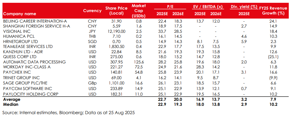 - Favourable secular growth trends – According to Converging Knowledge, the SME market for cloudbased SaaS HRMS and Accounting Software for Singapore, Malaysia, Hong Kong, and India combined was estimated at USD3.3b in 2024, which is 100 times of ITL’s FY24 revenue. These geographies are also expected to grow at compound annual growth rates (CAGR) of 11.9%, 9.2%, 10.0%, and 7.2%, respectively, from 2025 to 2029, underscoring ITL’s significant runway for growth. Given its focus on customer centricity, we think ITL is well -positioned to benefit from secular growth trends such as a global movement towards SaaS offerings (amidst growing digital transformation efforts across various industries and increasing policy support for digitalisation); rising strategic importance of human resource (HR) and finance departments; and a growing need for companies to stay compliant and mitigate regulatory risks, even as they continue to drive operational efficiency.
