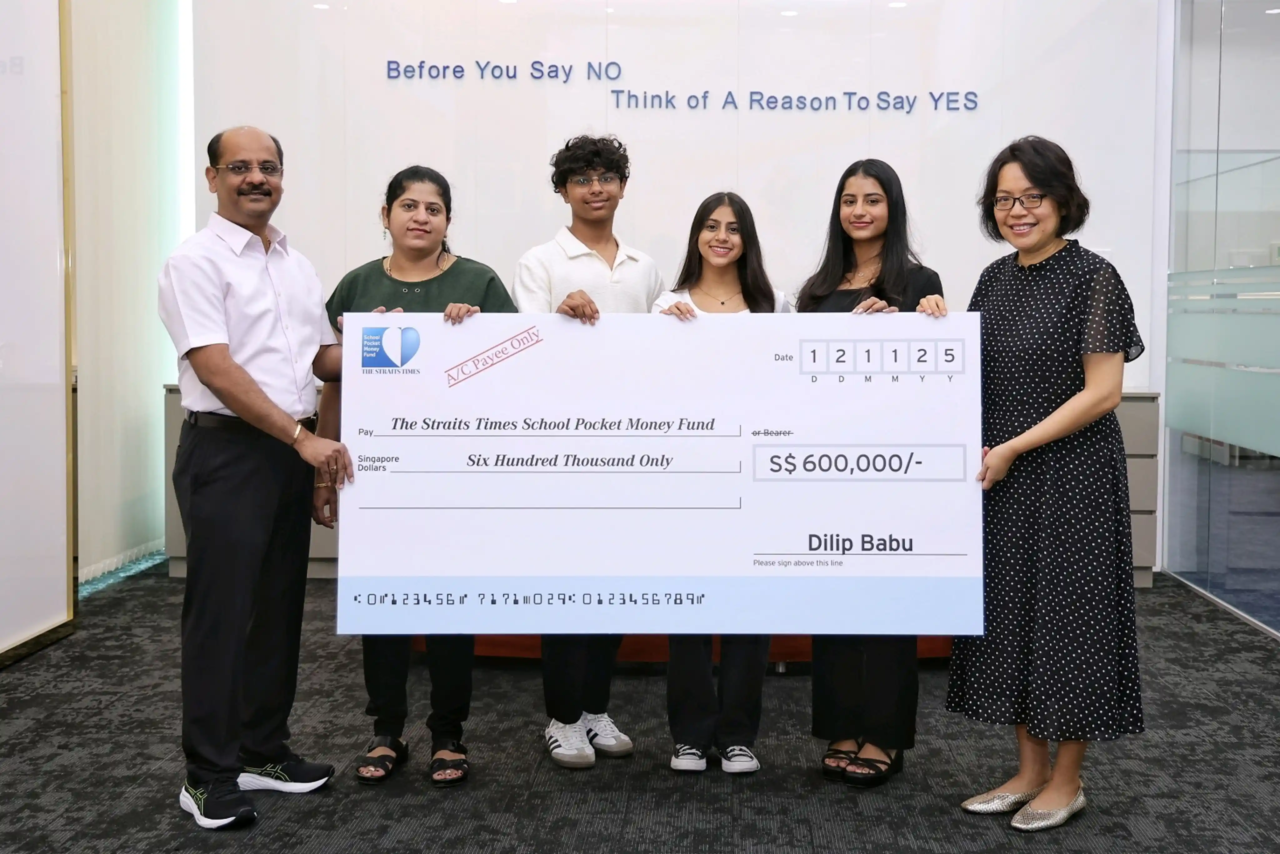 (From left) Mr Babu Dilip, chief executive officer of Info-Tech, accompanied by his wife Ramya and children Arjun, Harini and Srinithi as he presented a cheque of S$600,000 to Ms Lee Su Shyan, fund trustee and associate editor (news) at The Business Times, on 12 November 2025.